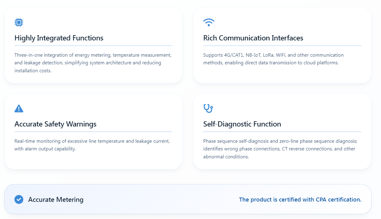 En réponse aux caractéristiques du marché de compatibilité multimarque dans les systèmes photovoltaïques et de stockage d'énergie, la configuration RS485 CT est adoptée pour s'adapter aux conditions d'installation incertaines des agents professionnels. Les instruments sont certifiés par les certifications internationales CE-MID, UL et RCM. Avec un taux de rafraîchissement des données à grande vitesse de 50 ms, les appareils prennent également en charge le réglage de la séquence de phases, garantissant une mesure précise et une forte compatibilité.