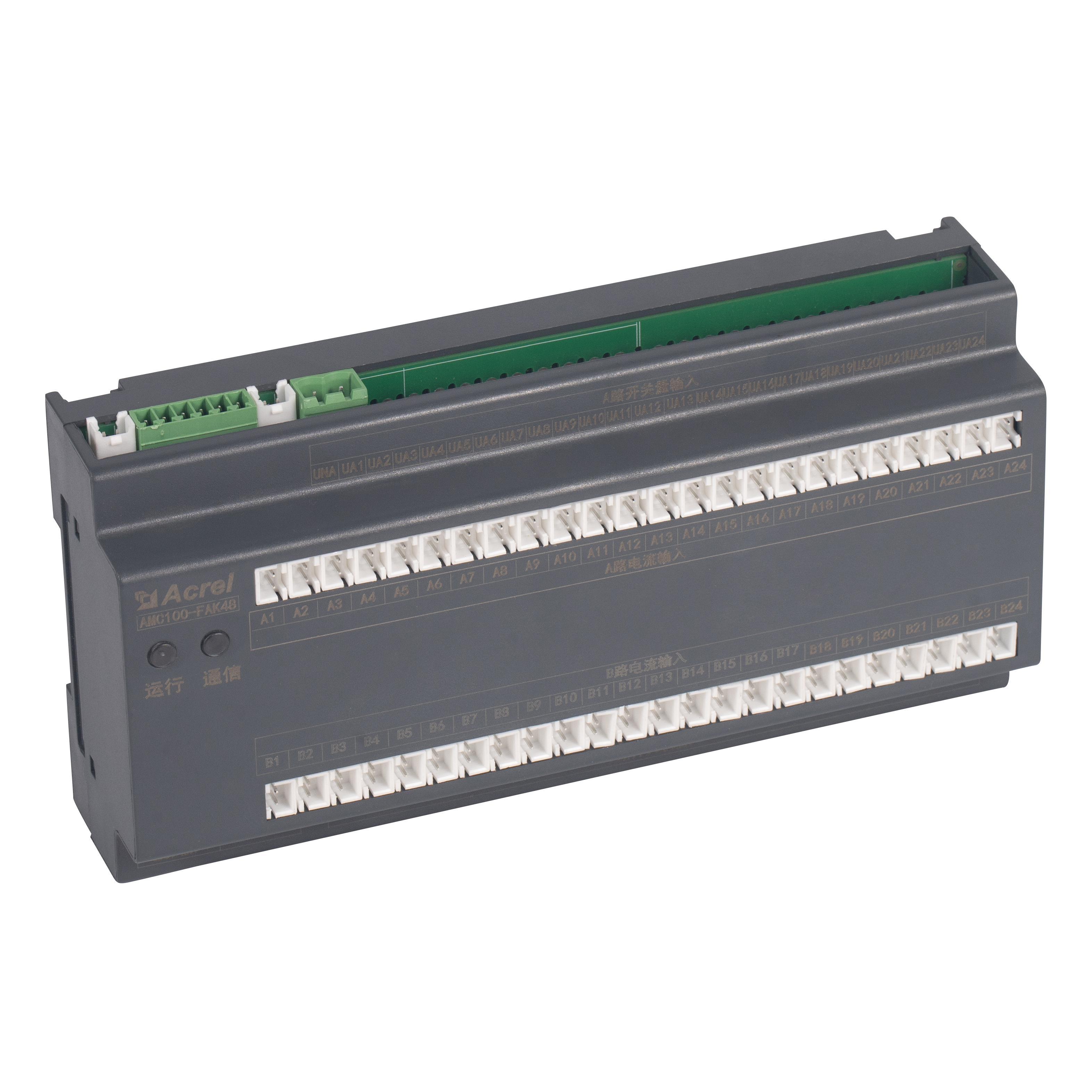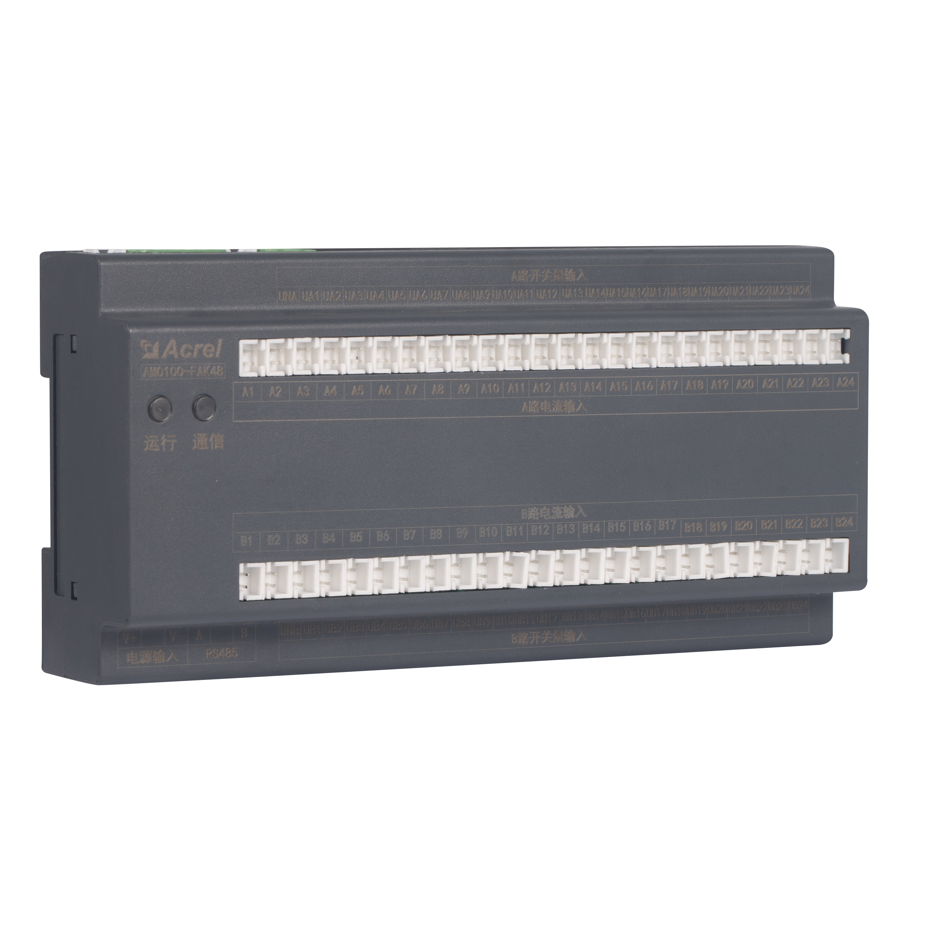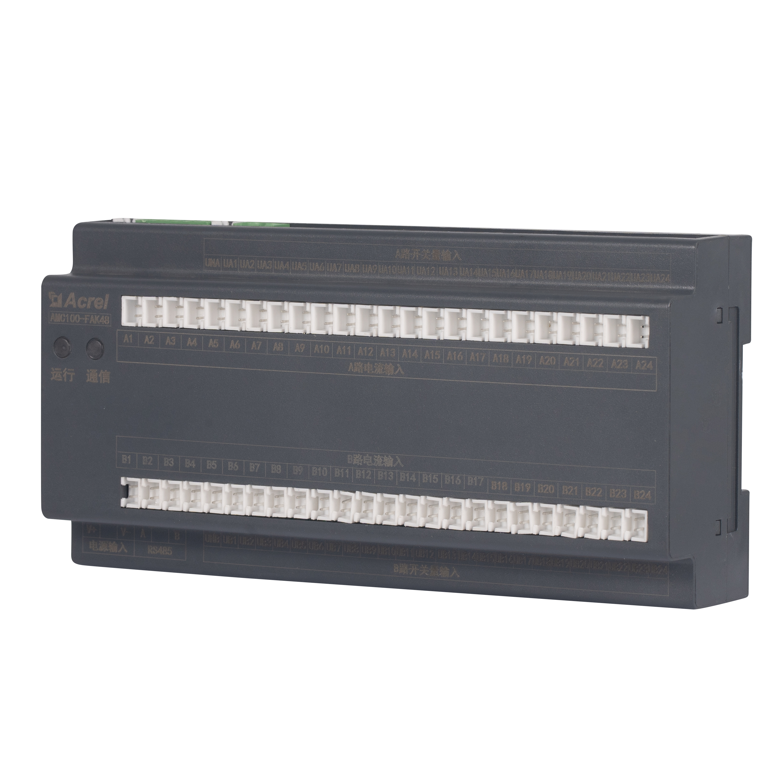 L'AMC100-FAK48 est l'unité de surveillance de précision de la distribution d'énergie CA sur rail DIN d'Acrel, conçue pour les racks de serveurs de centres de données. Il suit simultanément tous les paramètres électriques des doubles alimentations triphasées A B, 192 circuits sortants, 8 points d'état DI / 4 DO, 2 canaux de fuite, 1 capteur de température-humidité et 63 harmoniques. Trois ports RS485 Modbus-RTU permettent une intégration transparente BMS/DCIM. Un boîtier compact de 180 mm, une précision de ±0,5 %, des seuils d'alarme par canal et un avertissement sonore et lumineux instantané réduisent le gaspillage d'énergie et les temps d'arrêt, ce qui en fait le cœur évolutif des solutions de surveillance des barres omnibus CA ou des PDU des centres de données écologiques.