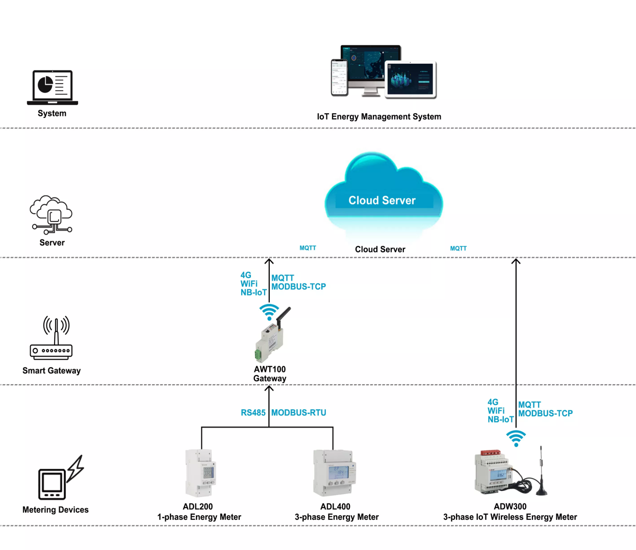 | ADW300 | Le compteur sans fil ADW300 est principalement utilisé pour mesurer la puissance active triphasée d'un réseau basse tension. Il dispose de fonctions de communication RS485 et de communication sans fil WiFi/4G/Ethernet/LoRa, ce qui permet aux utilisateurs de surveiller, lire et gérer la consommation électrique. Il peut être installé de manière flexible dans le boîtier de distribution pour réaliser des mesures de puissance de sous-éléments, des statistiques et des analyses de différentes zones et de différentes charges. | |
