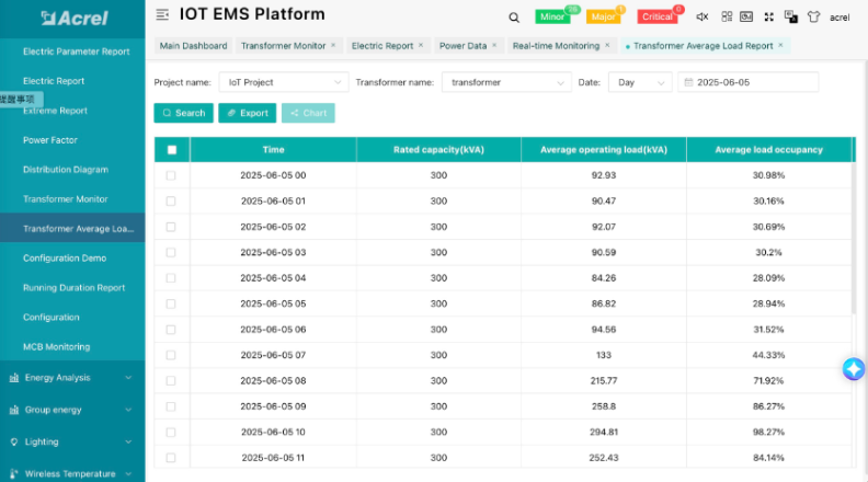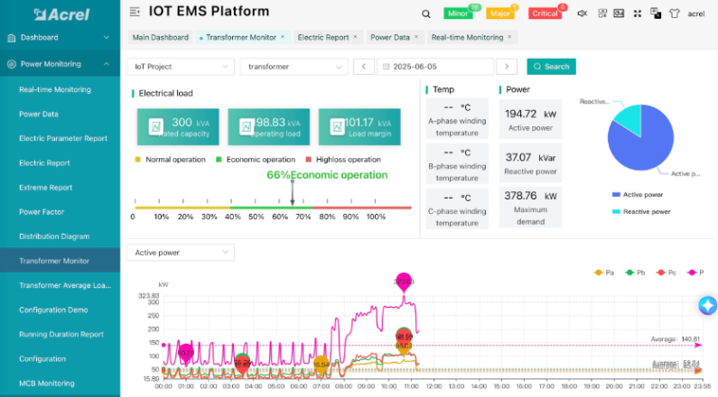 2. Visualisation du fonctionnement du transformateur : La plateforme surveille en permanence les paramètres critiques (courant, tension, facteur de puissance, etc.), garantissant que les transformateurs fonctionnent dans des limites de charge sûres et réduisant le risque de surcharge et de dommages.